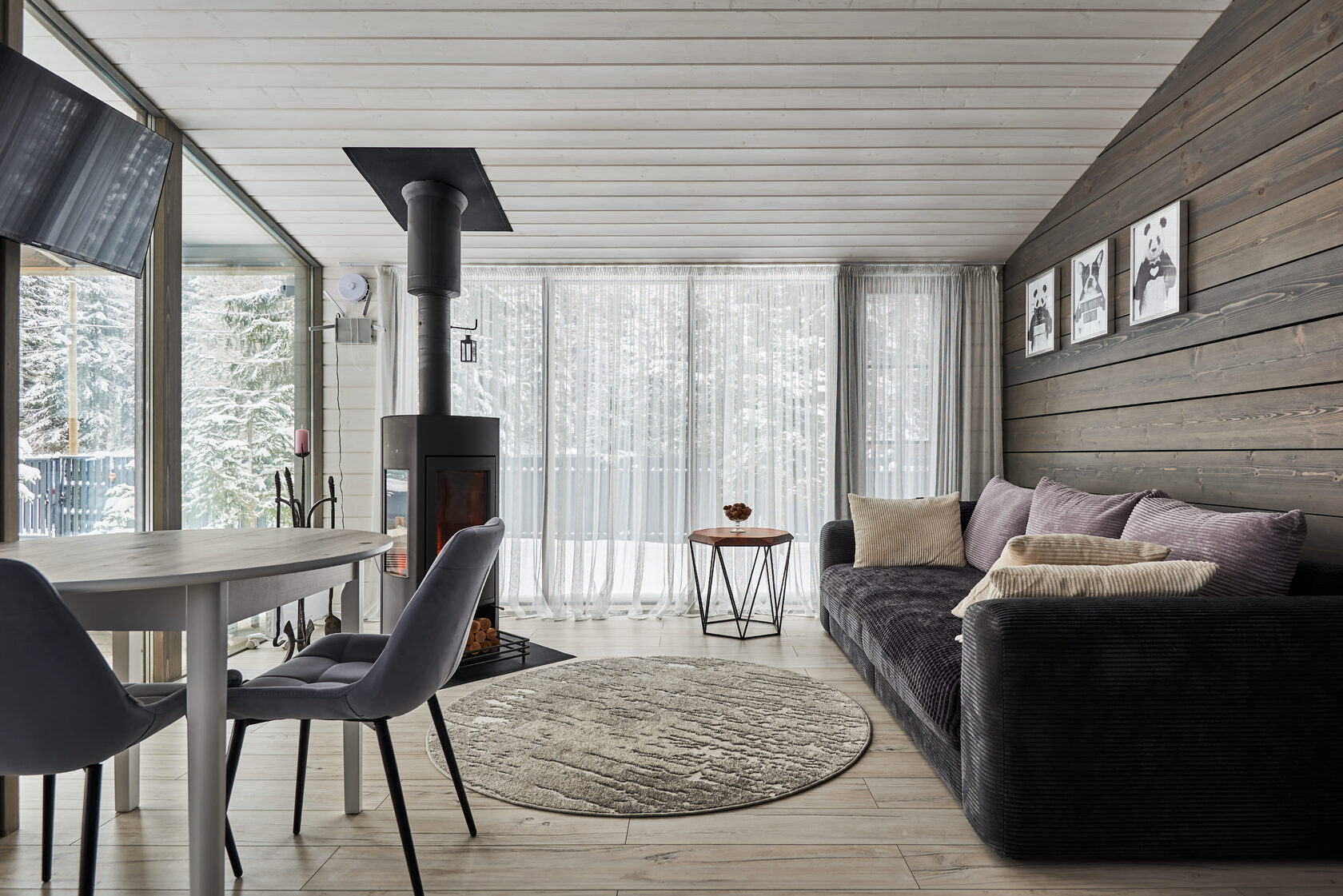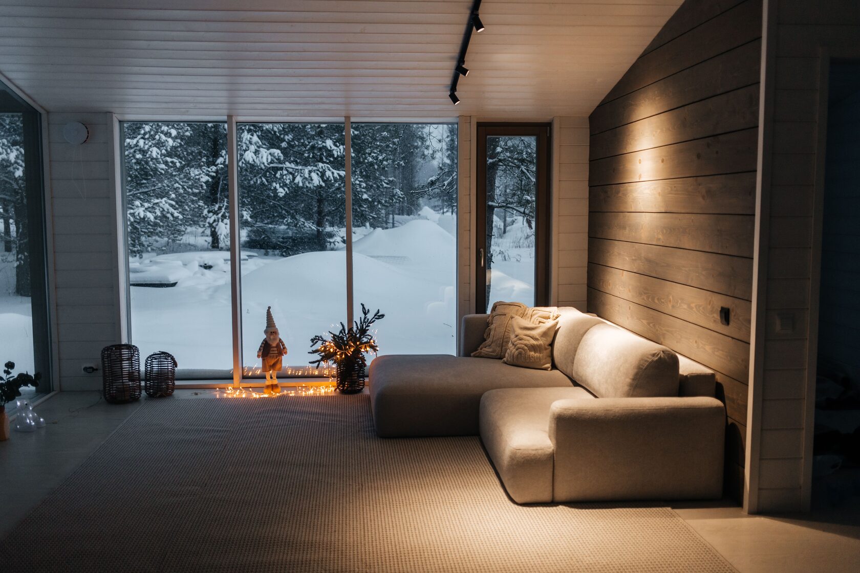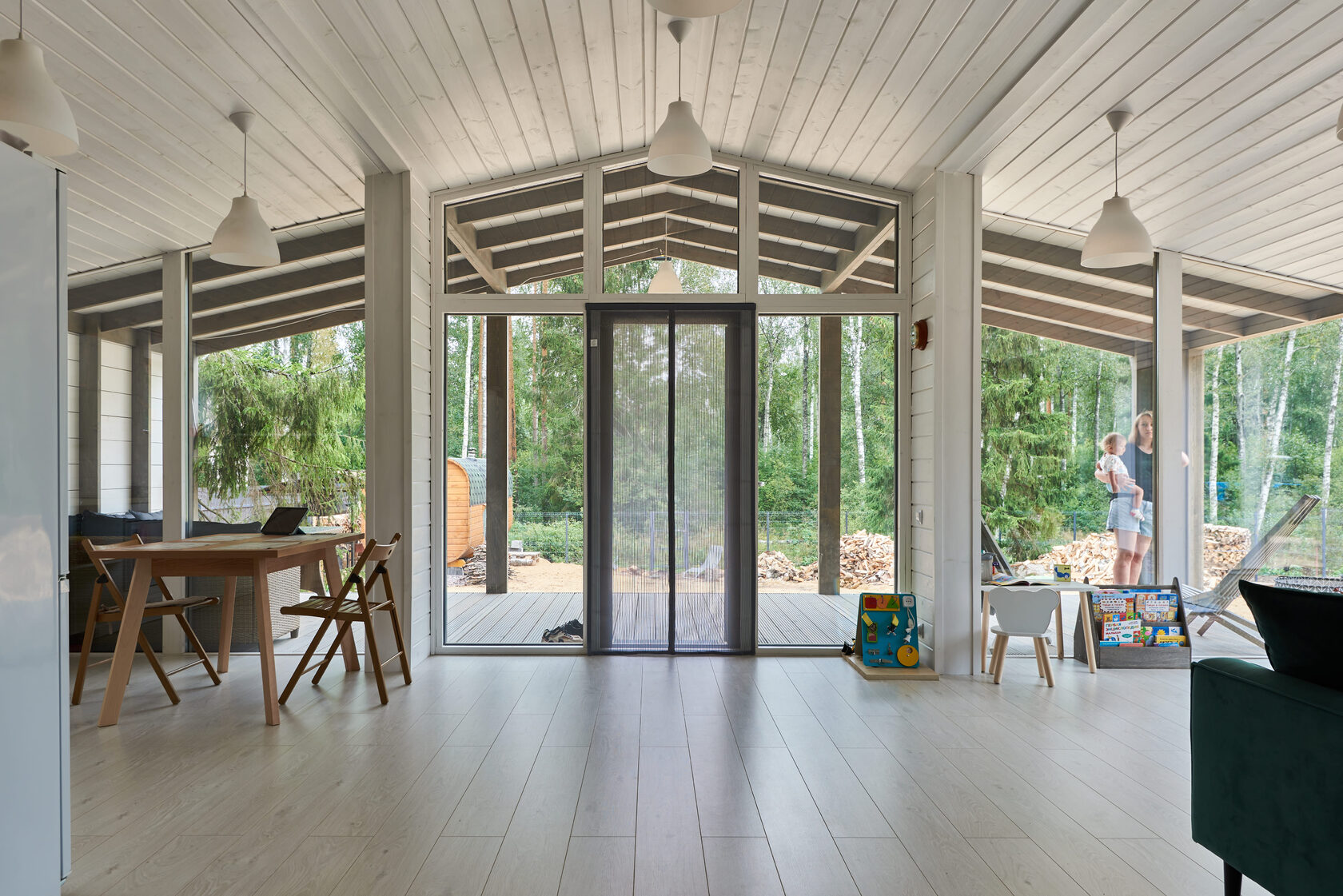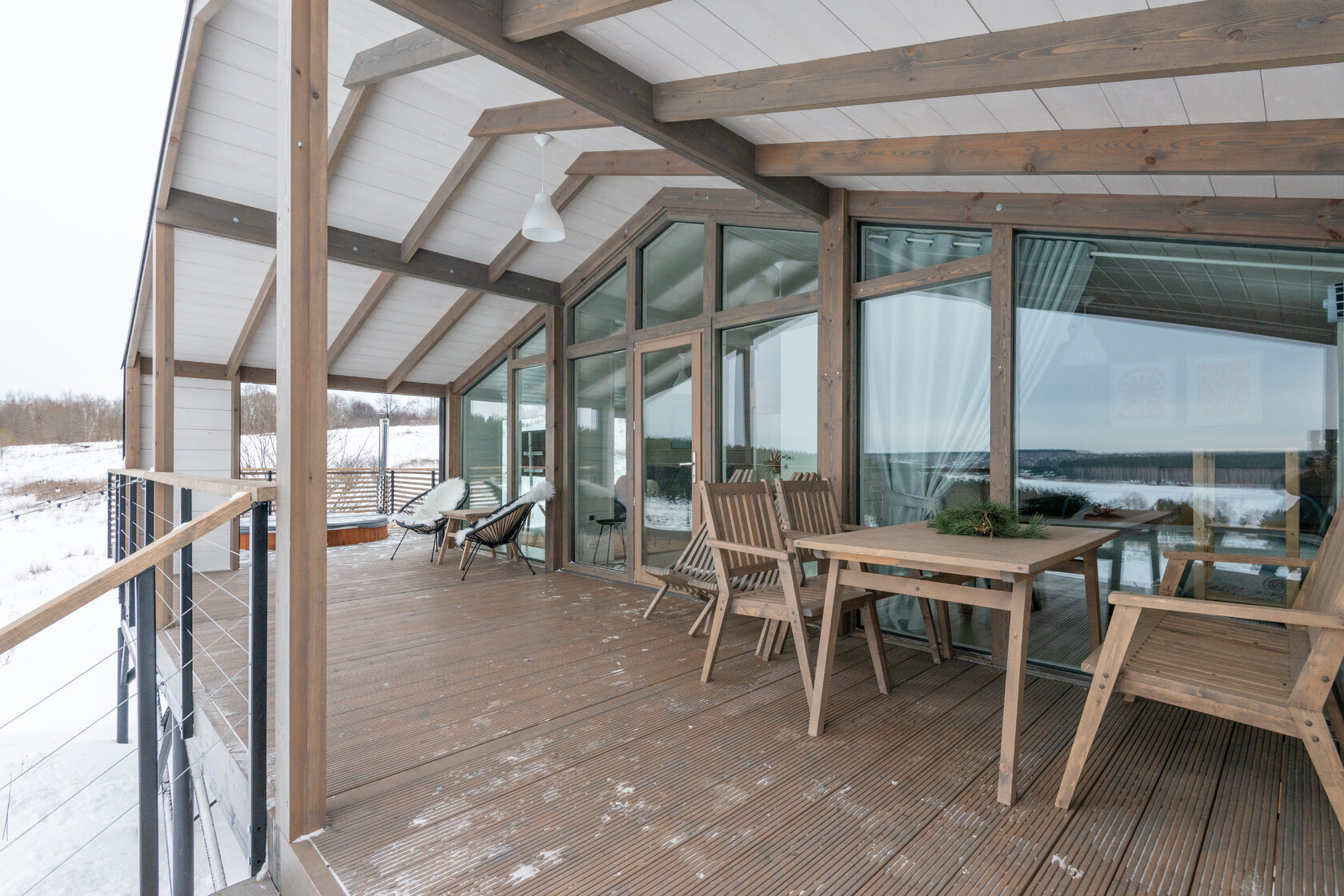 • Деревянные оконные рамы из трехслойного клееного бруса толщиной 78 мм, двухкамерные стеклопакеты.