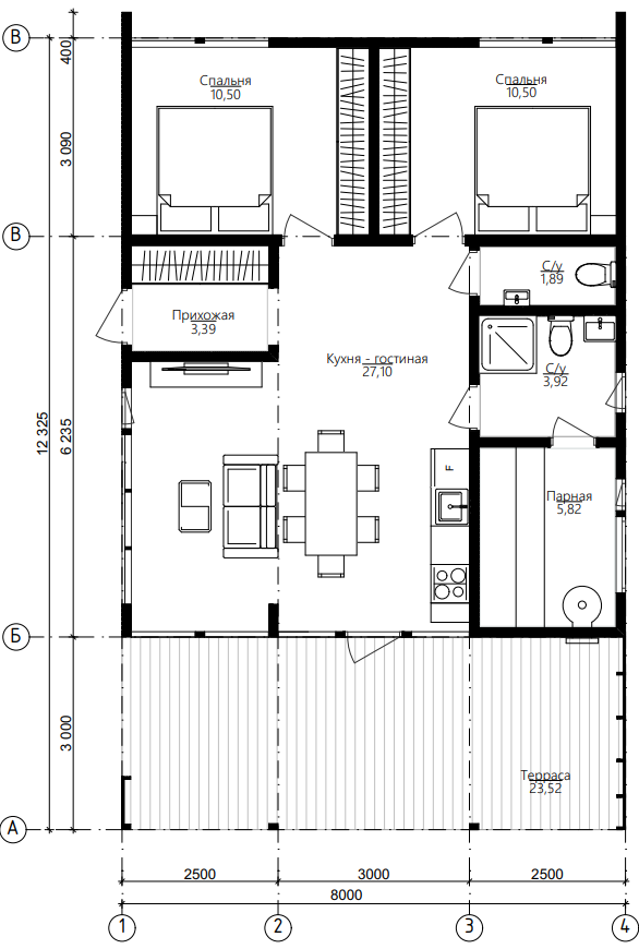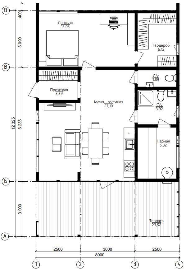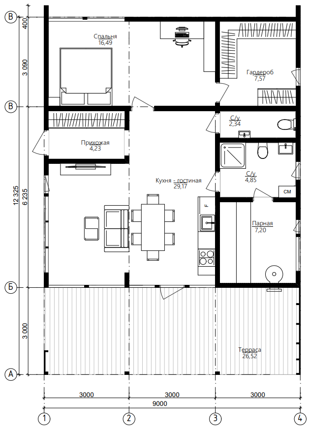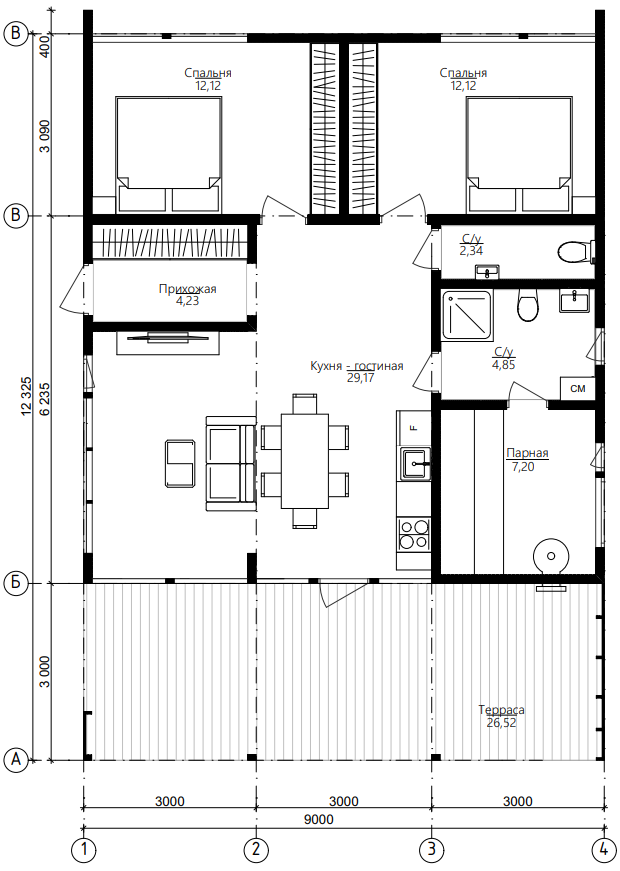 Парная, кухня-гостиная, 2 спальни, 2 санузла, прихожая, терраса
