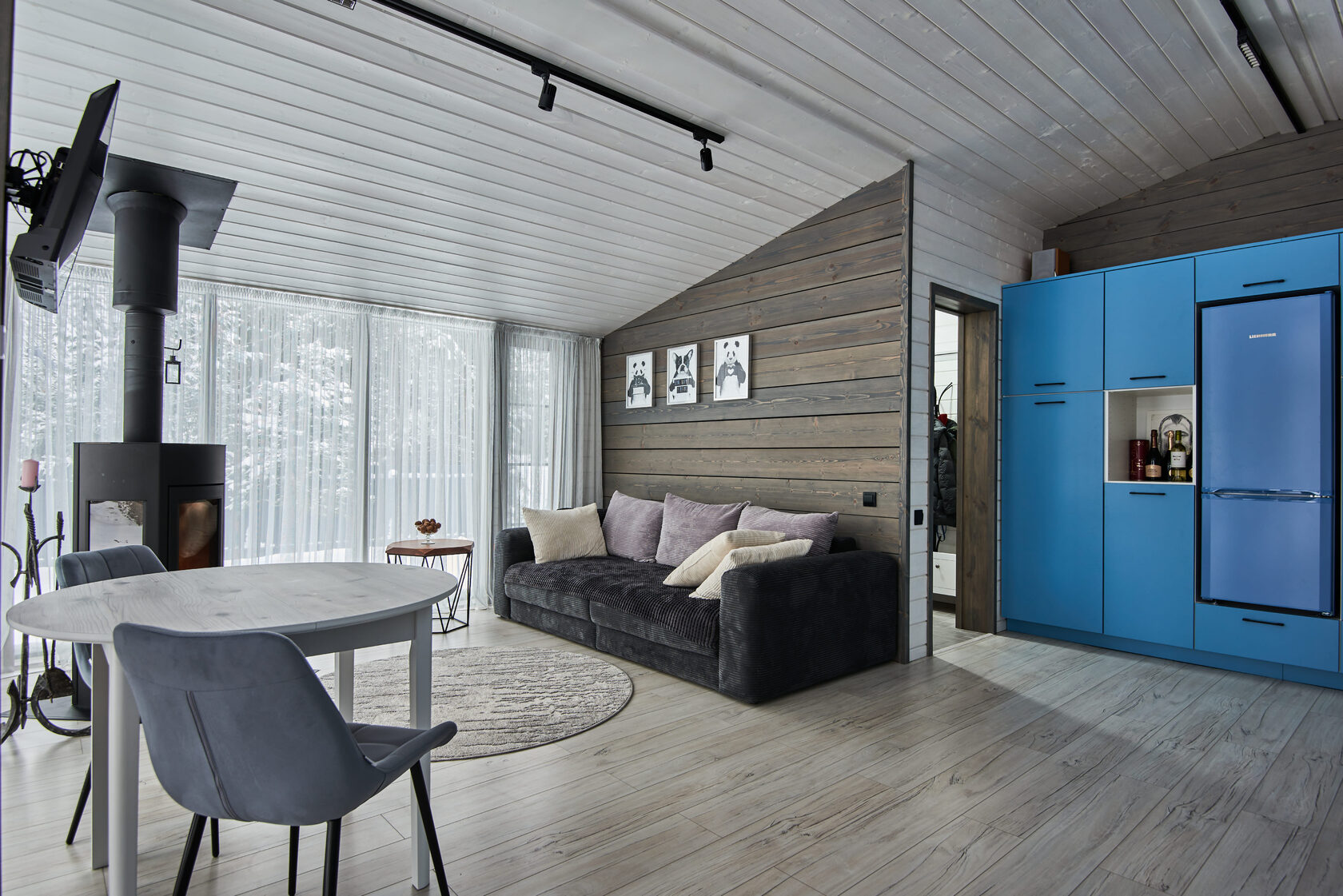 • Фасад - тонкопиленая доска с поднятым ворсом, профиль UYS, хвоя сорт АВ, металлический профилированный лист.