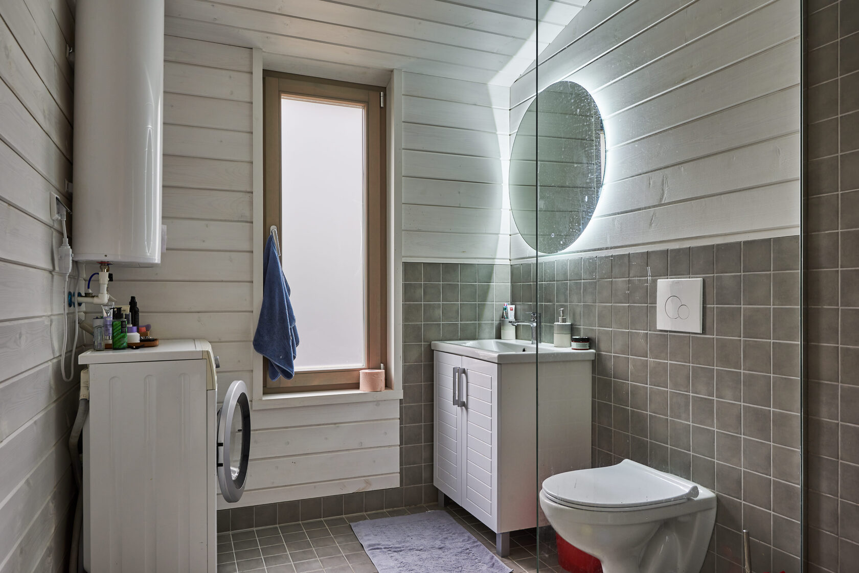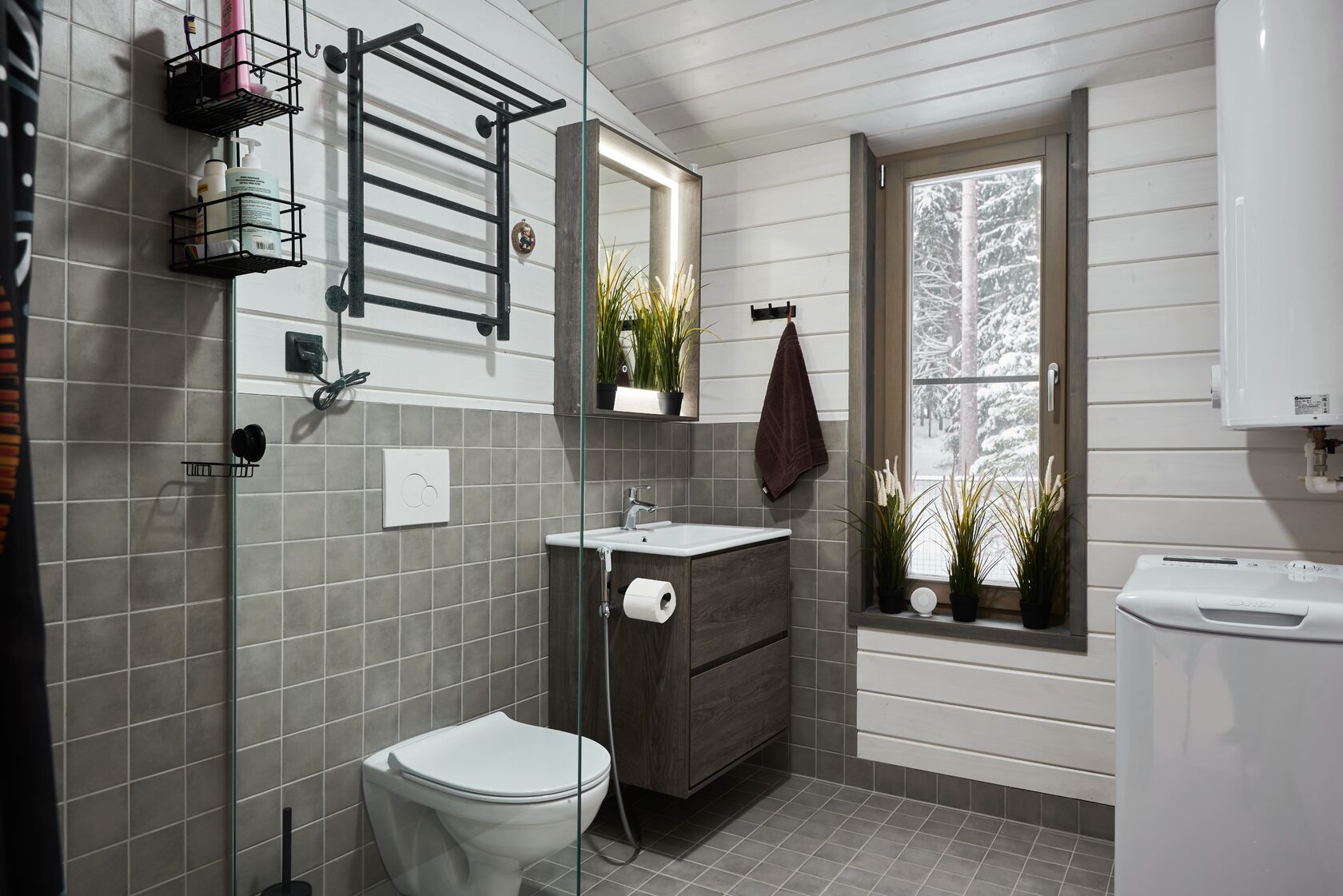 • Напольный унитаз как в модульных домах 43 и 65. Инсталляция как в домах 51 и 77, керамический душевой поддон с перегородкой из закаленного стекла, зеркальный шкаф, полотенцесушитель, раковина, душ и бойлер 80 литров.