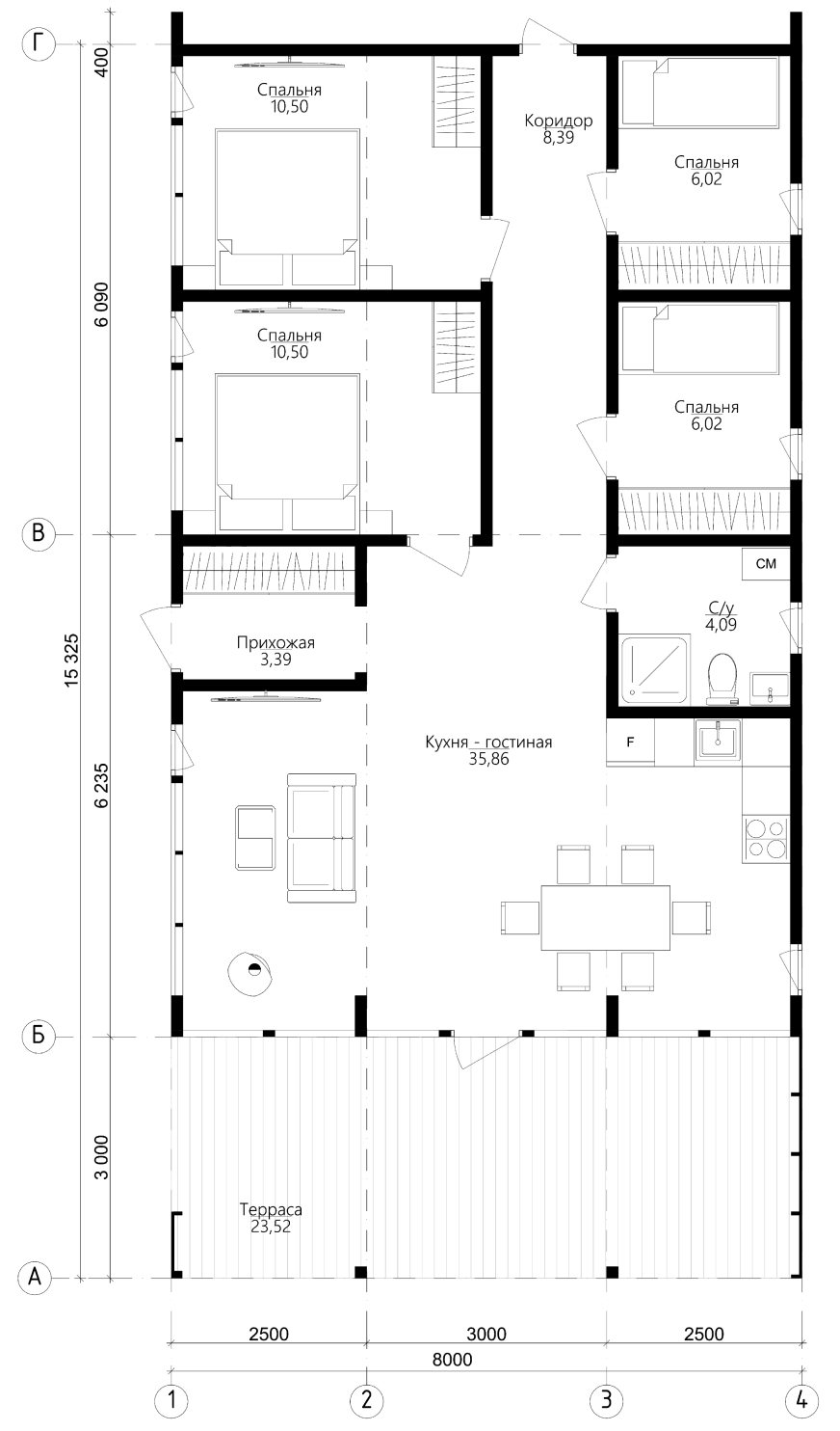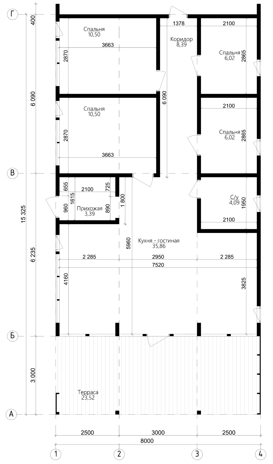 три спальни, два с/у, гардеробная, прихожая, без крытой террасы