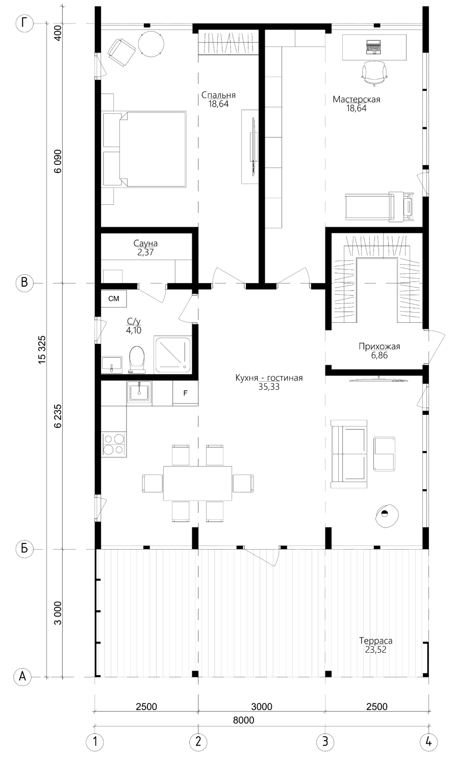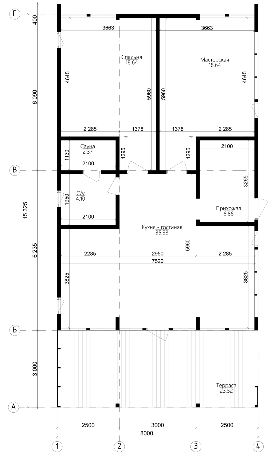 Габариты дома (ВхШхД) - 3,2х8х15